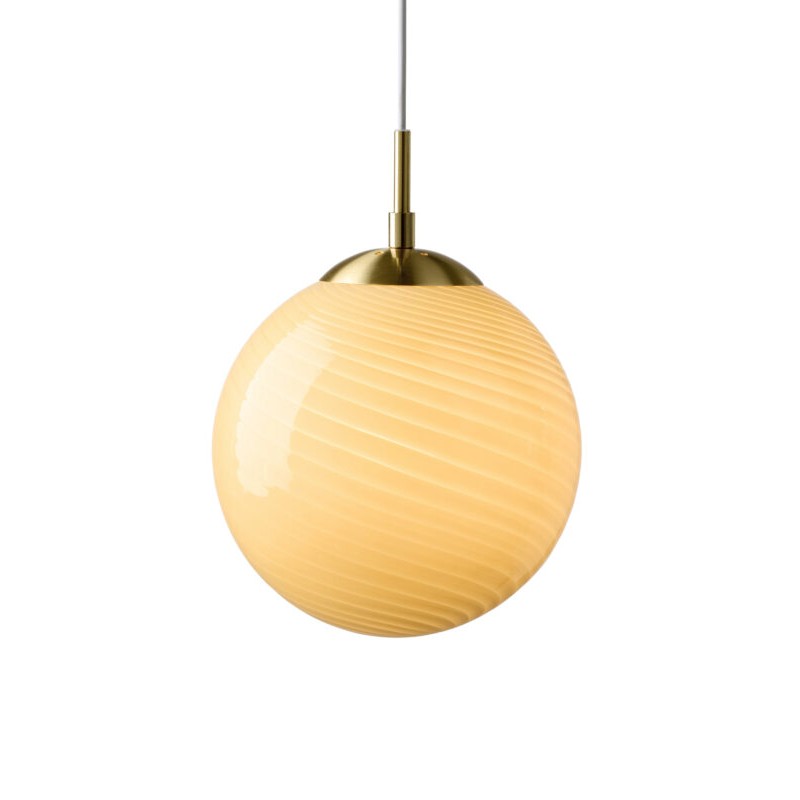 Candy takpendel 25 cream. Nydelig farget glass med spiralmønster. Kuppel med detaljer i børstet messing. 1xE27. Diam. 25cm. 2m ledning. Kan skaffes i andre farger.