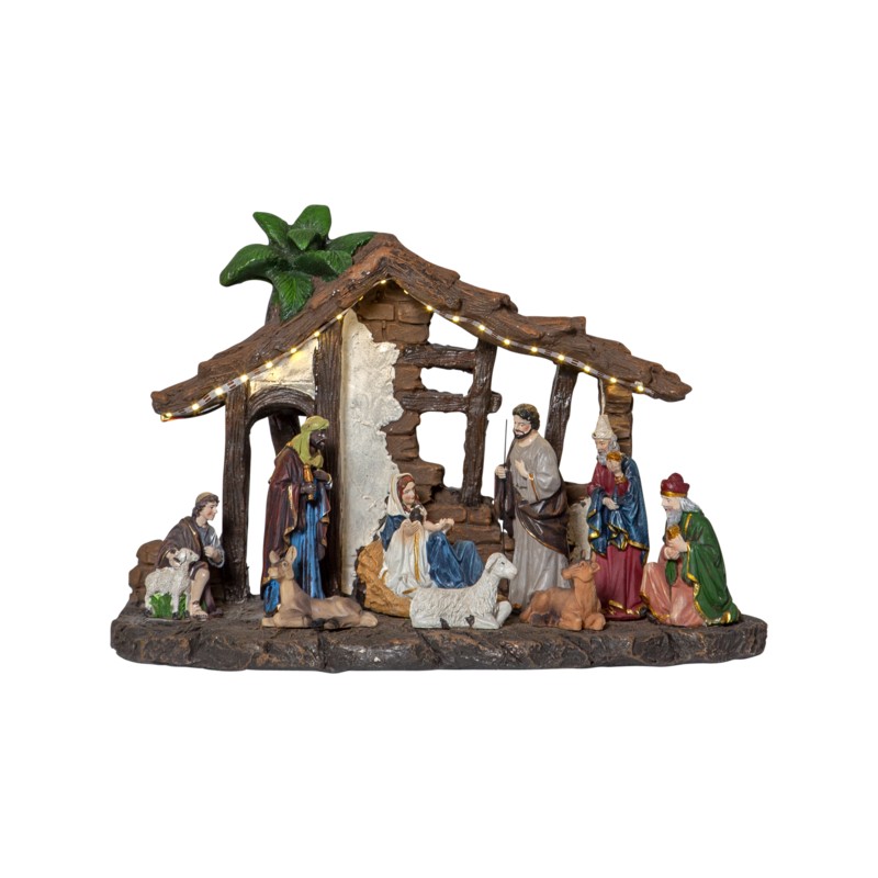 Nativity julekrybbe med 19 LED-lys. Batteridrevet med timerfunksjon. Bredde 37 cm.