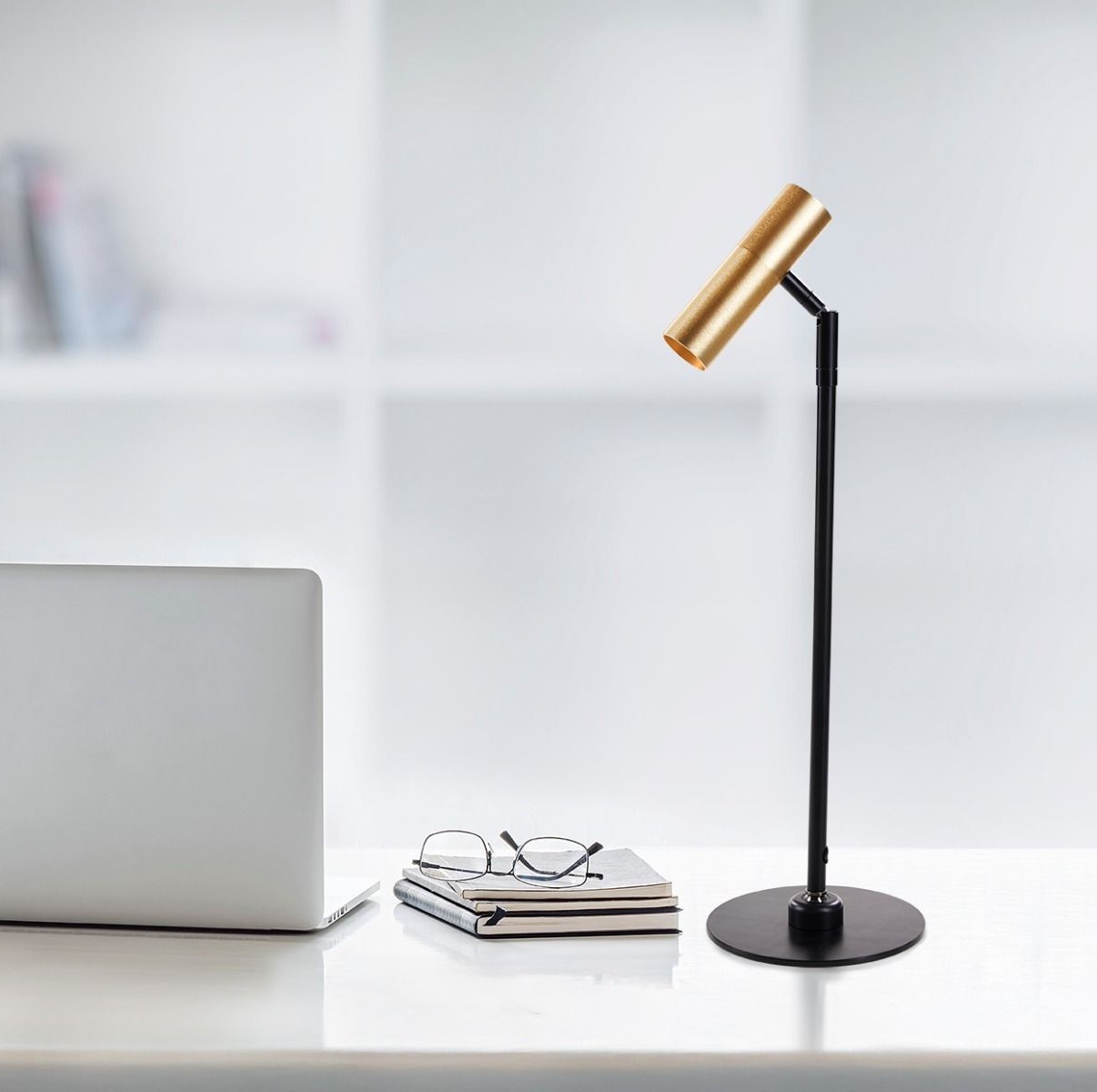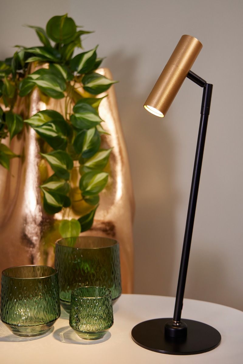 Miller bordlampe sort/børstet messing. Kuleledd i foten for regulering av lampens vinkel i tillegg til vridbart hode. 1xGU-10 mini (lyspære medfølger ikke), Høyde 52 cm. Av/på knapp på lampehodet.