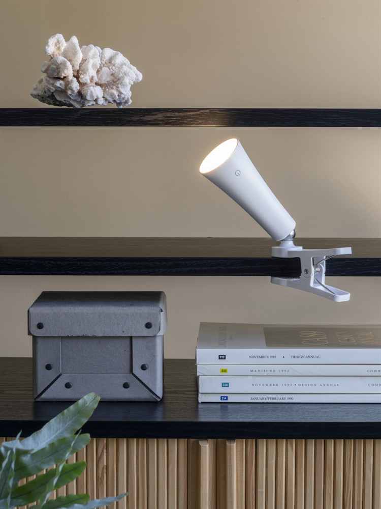 Oppladbar bordlampe LED. Hvit. Det vridbare og avtagbare lampehodet har dimmefunksjon i tillegg til at fargetemperaturen kan endres i 3 trinn (1800K, 2500K og 3000K). Det medfølger Usb ladekabel (ikke plugg), klypefeste og veggfeste. Kun for innendørs bruk.